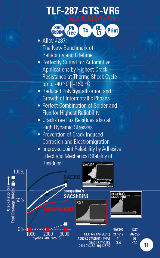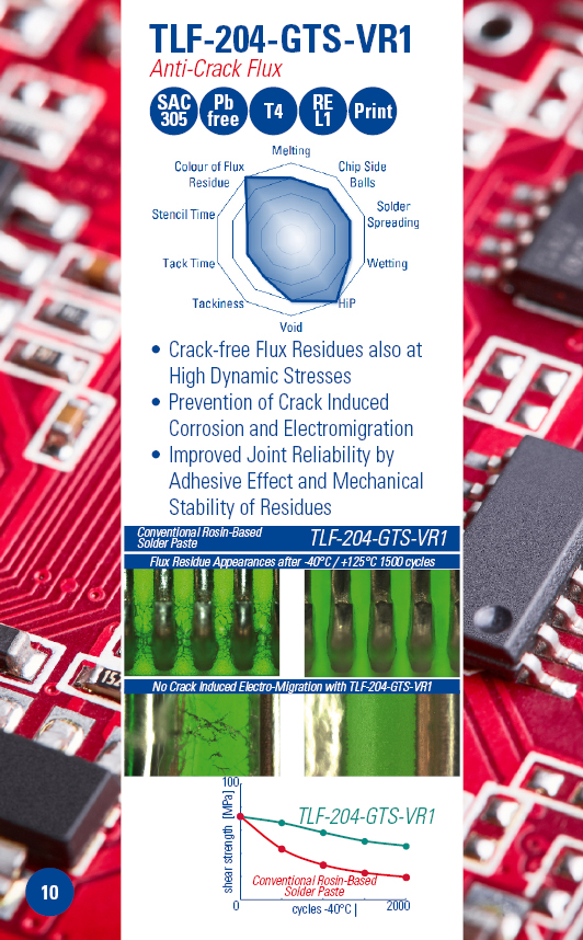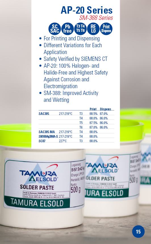 Further benefits include minimal shrinkage, high printing speeds and high activity on all surfaces. TAMURA ELSOLD® solder pastes are ideal for closed chamber doctor blade systems and for fine-pitch printing.